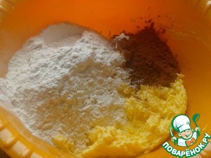 Всыпать муку и какао. Перемешать миксером на небольших оборотах.