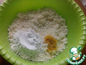 Творог размять. Вмешать крахмал и лимонную цедру (чем более влажным будет творог, тем больше крахмала нужно в него добавить). Перемешать.