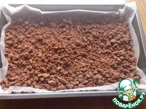Прямоугольную форму ( 16*25) или круглую ( d=22~24см) застелить изнутри бумагой для выпечки. На дно формы высыпать половину теста. Разровнять, но не приминать.