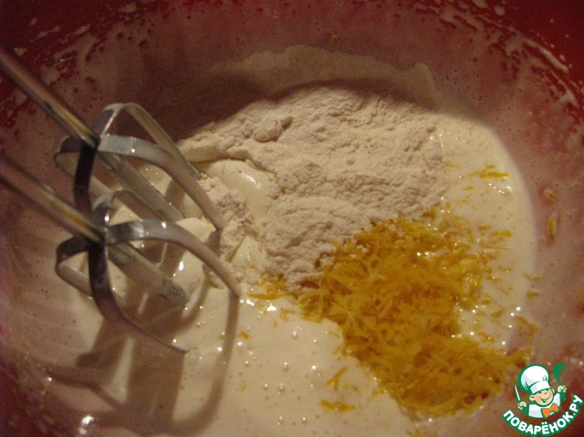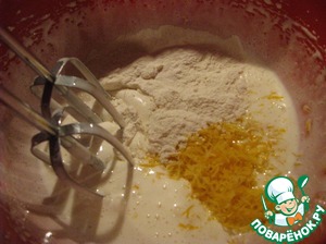 Во взбитые яйца добавить цедру и 30 гр. муки. Взбить ещё минутку.