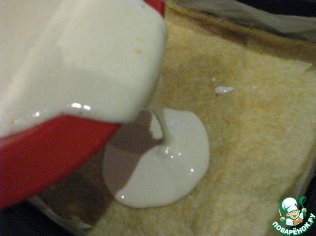 Выливаем взбитый верхний слой на запеченный корж. Взбитый второй слой десерта должен получится как густой йогурт.