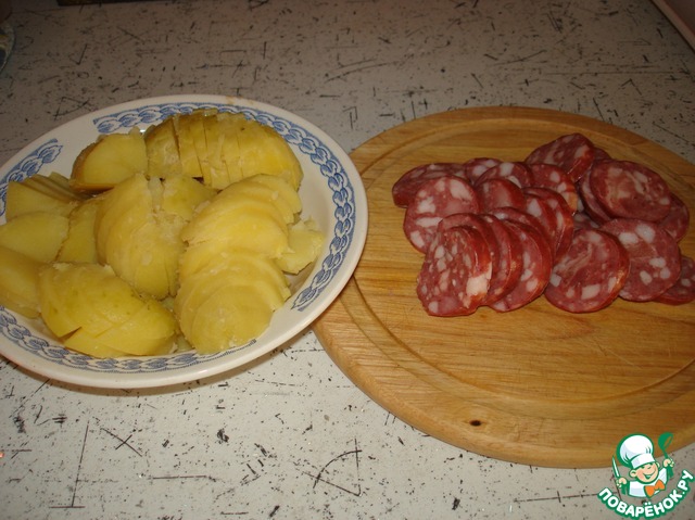 Очищенный отварной картофель и колбасу нарезать кружками.