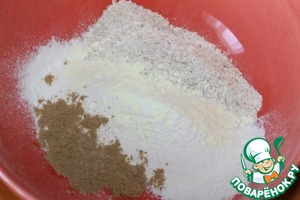 Смешиваем муку, перемолотые овсяные хлопья, разрыхлитель, шафран и имбирь, перемешиваем.