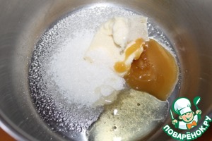 На слабом огне подогреть сливочное масло, сахар, мёд и потоку до однородной консистенции, но не кипятить!