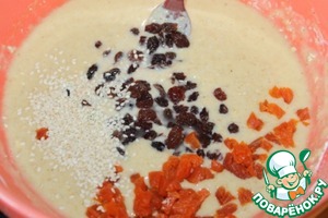 Добавляем промытый изюм, кунжут и мелко порезанную курагу, перемешиваем.
