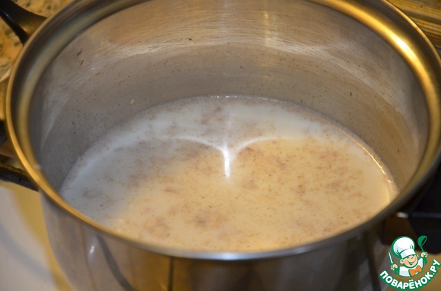 В это время варим кашу по вашему любимому рецепту. У меня это 1/2 стакана хлопьев+1 стакан молока+1/2 стакана воды. Сахар советую не добавлять