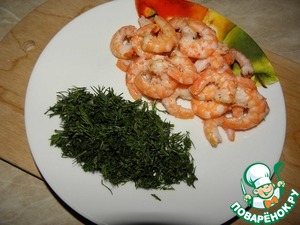 Креветки отварить 1-2 минуты, очистить, и можно разрезать на 2 части. Укроп мелко порезать, и добавить в рыбное суфле.
