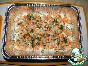 Взять небольшую форму ( если нужно, застелить пергаментом или фольгой). Смазать растительным маслом, нижний слой выложить половину рыбного суфле, средний слой креветки.