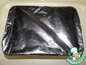 Форму накрыть фольгой, поместить ее в глубокий противень с высокими бортами, наполнив его до половины горячей водой, и поставить в разогретую духовку 180-190%. На 1ч -1ч 20 минут