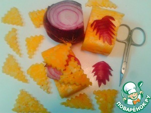 Из красного лука и оставшегося сыра вырезаем листья.