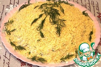 С горбуши слить жидкость и размять рыбу вилкой. Выложить на блюдо. Это будет 1-ый слой.
