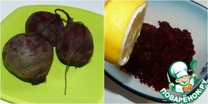 Сначала надо отварить (или запечь) свеклу, но не переваривать. Остывшую свеклу расчистить и натереть на мелкой терке. И сразу же сбрызнуть свеклу лимонным соком.