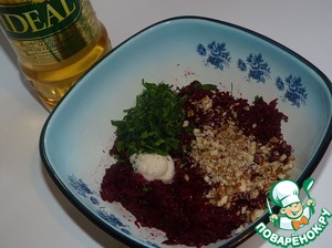 Измельчить зелень и грецкие орехи. И добавить зелень с орехами в свеклу. Добавить хрен, по вкусу соль и сахар. Все перемешать и заправить растительным маслом (я использовала подсолнечное рафинированное "IDEAL")