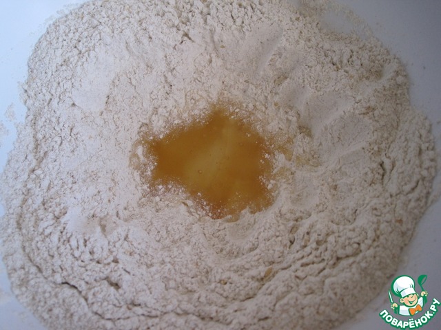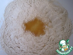 Сделаем лунку, выливаем в неё мёд и дрожжевую смесь.