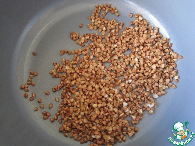 Самое время заняться начинкой. Гречневую крупу промываем и слегка обжариваем на сухой сковороде примерно 5-ть минут, до проявления аромата гречи.