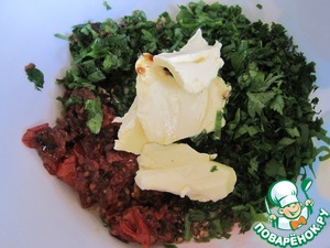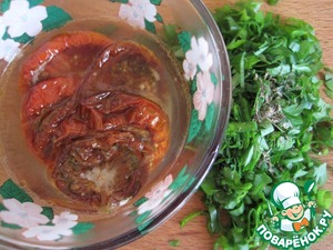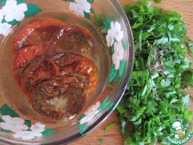 Вяленые томаты заливаем тремя столовыми ложками горячей воды и даём настояться (настой нам тоже понадобится в начинку). Зелень мелко рубим (только листочки, без стебельков) В идеале тимьян должен быть свежим. У меня к сожалению нет его, поэтому я добавила щепотку сушёного тимьяна.