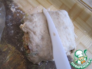 Тесто раскатываем в пласт (не очень тонко). Распределяем равномерно начинку и сворачиваем всё рулетом, начиная с широкой стороны пласта. Получился длинный и узкий рулет.
