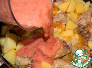 Добавить томатное пюре в сковороду. Посолить, поперчить, посыпать зеленью. Накрыть крышкой и тушить минут 20, до полной готовности курицы и картошки, периодически перемешивая.