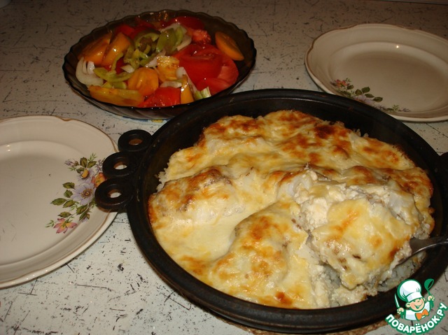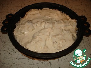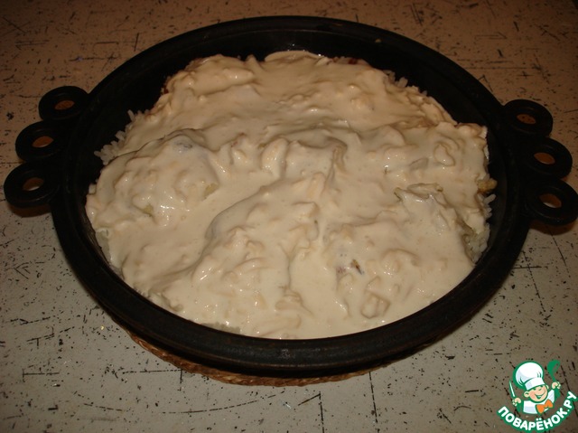 Смешать сметану с мукой и натёртым сыром. Покрыть смесью рыбу и рис.