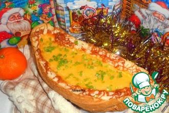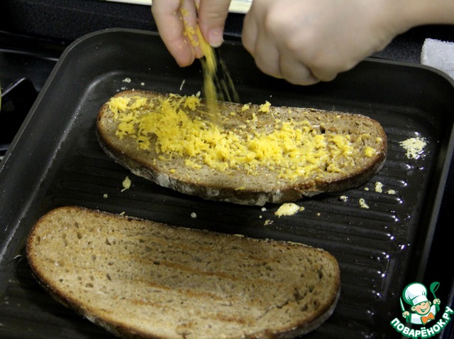 • Сыр натираем на мелкой терке и посыпаем один кусок хлеба.