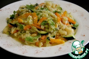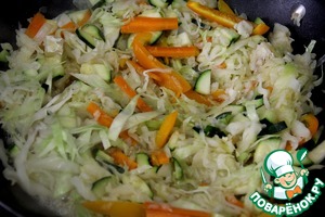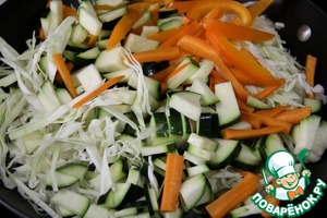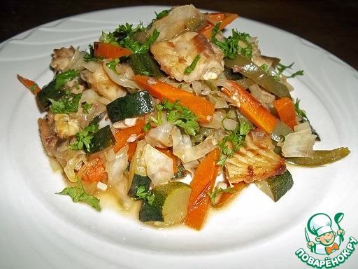 Капусту мелко нашинковать, перец и морковь нарезать тонкими полосками, кабачок полосками или кубиками. Добавить к рыбе и потушить при закрытой крышке около 5 минут.