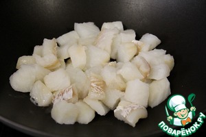 Филе рыбы порезать на небольшие куски и слегда обжарить на сковороде. Около 3-5 минут.