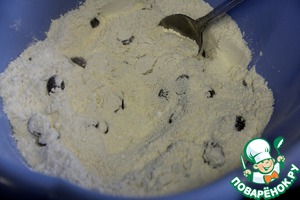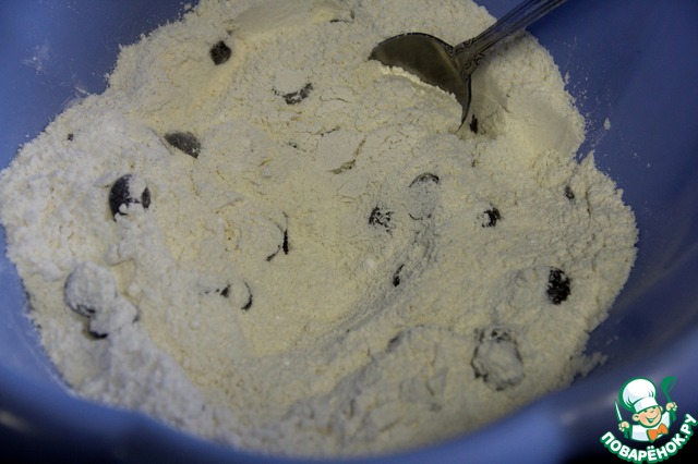 Смешиваем сухие ингредиенты ( муку, сахар, пекарский порошок, соль, чернику и шоколад).