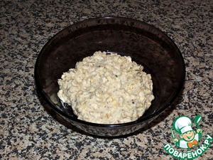Орехи измельчить (не совсем в пудру). Соединить с просеянной мукой, содой и овсяными хлопьями ТМ Мистраль.