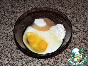 Для заливки пирога смешать яйца, йогурт, сахар, корицу и муку.