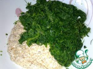 Размораживаем слоеное тесто и займемся приготовлением начинки. Шпинат разморозим в микроволновке, а затем хорошенько его отжимаем. Добавляем шпинат к заваренным овсяным хлопьям. Все хорошо перемешать.