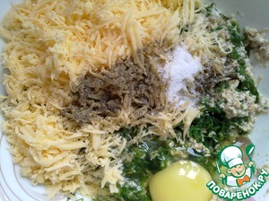К массе из шпината и овсяных хлопьев добавляем натертый на мелкой тёрке сыр, яйцо, солим и перчим по вкусу. Массу хорошо перемешиваем.
