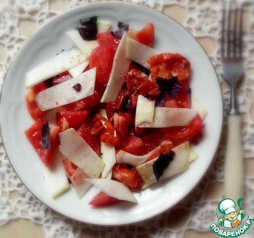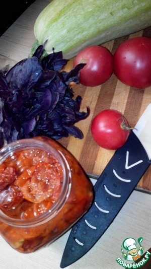 Нарезаем помидор небольшими кусочками, тонко режем кабачок (шкурку снимаете по желанию), крупно рвете базилик, если вяленые помидоры крупные - разрежьте пополам. Все перемешиваем, заливаем нашей заправкой.