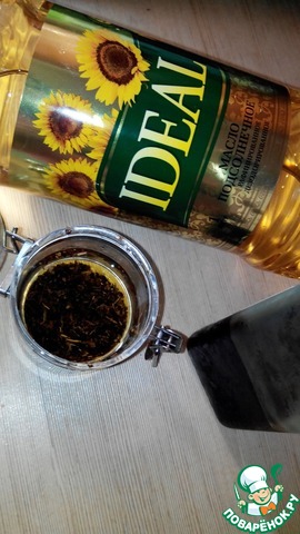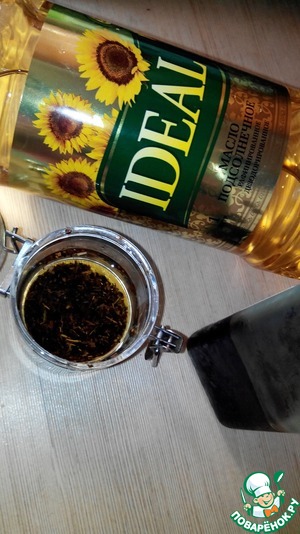 Я уже говорила, что у меня всегда есть небольшая баночка "ароматного" масла. Любимые сухие травы (в данном случае базилик), заливаю маслом и настаиваю. В салаты очень вкусно! -