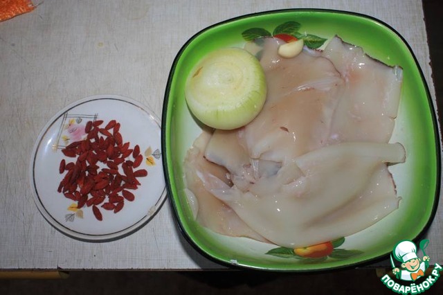 Почистил. Смолол кальмар, лук, чеснок. В хозяйстве не нашлось ни барбариса ни зерен граната, зато нашлись ягоды годжы. Смолол их туда же |