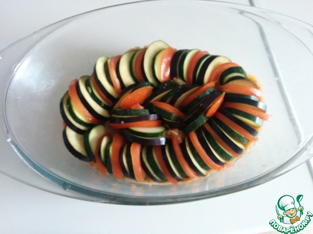 Поверх соуса выкладываем нарезанные кружками овощи, чередуя между собой так, чтобы каждый кружок накрывал другой, оставляя в каждом кружочке открытым примерно полсантиметра (можно поучиться у Реми, в мультфильме он делает это просто виртуозно).