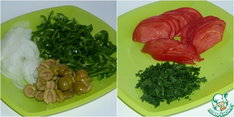 Лук нарезать тонкими полукольцами, перец - соломкой, помидор - дольками. Мелко нарезать зелень петрушки. Маслины (или оливки) - разрезать пополам (но можно оставить их целыми). -