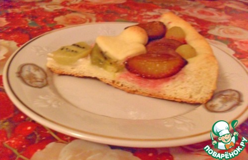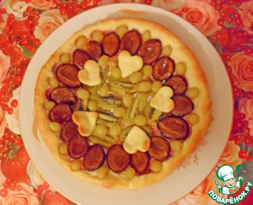 По кругу выложим половинки слив, в центре - киви, декорируем виноградинками. Сверху посыплем сахаром. -