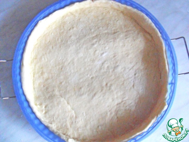 Готовое тесто раскатать, уложить в форму (у меня силиконовая), излишки срезать. Поставить в теплое место для расстойки, пока готовится начинка.