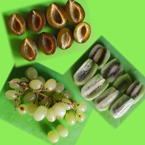 Сливы разрезать пополам, вынуть косточки. Киви (у меня мелкие) очистить, порезать пластинками. Виноград разобрать на ягодки.