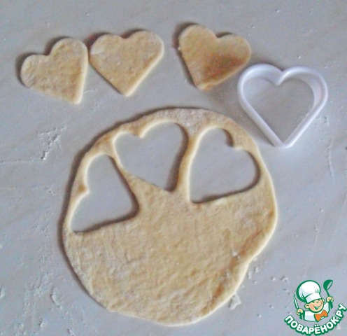 Обрезки теста я слепила, раскатала тонким слоем и формой для печенья вырезала сердечки, украсила ими пирог.