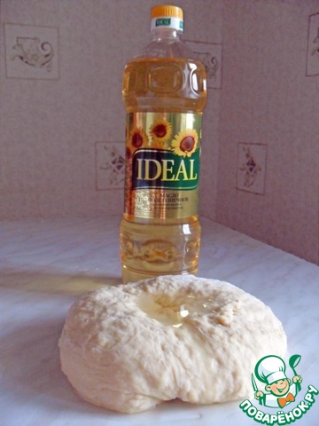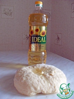 В тесте сделать углубление, вылить в него 20 мл подсолнечного масла "ИДЕАЛ" рафинированного дезодорированного. Хорошо вымесить тесто, поместить его в кастрюлю, укрыть пленкой и поставить в теплое место примерно на 1-1,5 часа -