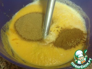 • Затем добавим 1 стакан коричневого сахара и специи ( 1ч. ложка корицы, 1ч. ложка имбиря, 1 ч. ложка мускатного ореха). Смешиваем блендером на малых оборотах, чтобы в массе было как можно меньше пузырьков воздуха.