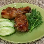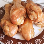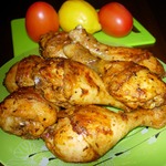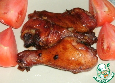 Маринад, в котором были голени, поставить на средний огонь, и постоянно помешивая уварить до густого состояния. За 15 минут до готовности курочки, достать голени и обильно смазать маринадом