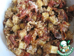 А пока займёмся начинкой. На самом деле это не совсем начинка. Это то, что мы позже вмешаем в тесто. Но всё по порядку. Сыр нарежем мелким кубиком, вяленые томаты порежем помельче, смешаем ржаную муку и отруби.