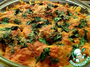 Сверху выложить слой лука, слой картофеля с помидорами, посолить, поперчить, сбрызнуть маслом и посыпать сыром. Сверху последнего слоя выложить зелень и поставить в разогретую до 180 градусов духовку.