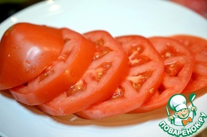 Каждый ломтик помидора и моцареллу полить заправкой. Посолить, поперчить.