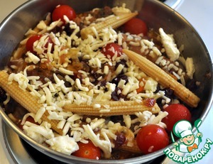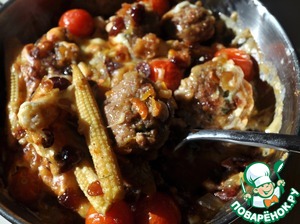 Заливаем сковороду с фрикадельками полученным соусом, добавляем протертую морковь, помидоры черри и молодую кукурузу. Хорошо так же добавить запеченую тыкву, порезанную на кусочки. Сверху посыпаем протертым сыром и ставим запекать в духовку на 20 минут