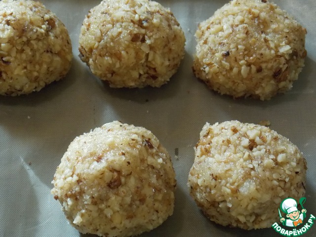 Берем не большие кусочки, формуем шарики и обваливаем их в орехах. Положить на противень.