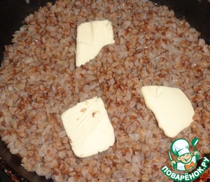 Воду выливаем в сковороду и солим по вкусу. Когда вода закипит, всыпать гречку. Варим на медленном огне под немного закрытой крышкой до готовности. В готовую гречку кладем сливочное масло и перемешиваем.