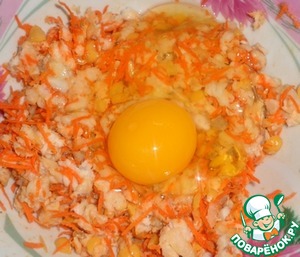 Заранее отварить рыбное филе и нут в подсоленной воде. Затем порезать рыбное филе на кусочки. нут также измельчить. К рыбному филе добавляем морковь (мелкая терка) и нут. Перемешиваем.